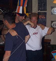 Owen'Cymbals' trying to impress Tel Griffin with his Hawaii 5-O shirt..